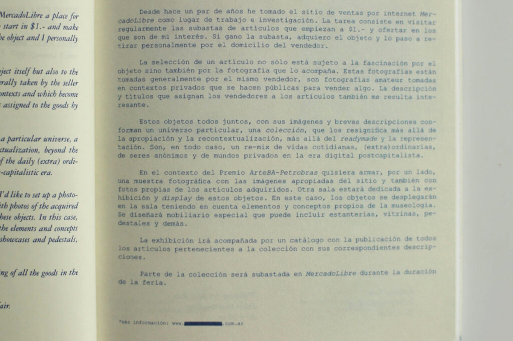 Como contenido para el libro, recuperé una carpeta que Flor había presentado a ArteBA y con ese material elaboré una especie de facsímil. En sus últimos años estaba desarrollando Mercadolibre, una muestra apócrifa, de tinte postcapitalista, con objetos comprados en subasta. La presentación contenía ese y otros trabajos, que también fueron incorporados en la edición.