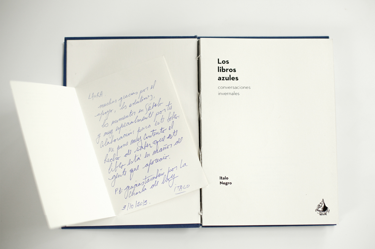 Entre lecturas y mate o vino, según la preferencia, revisábamos los proyectos en curso. En uno de los viajes a Burzaco, Italo Negro me invitó a diagramar la tapa de Los libros azules, un libro de fotos del cual ya tenía impreso el interior y necesitaba resolver la tapa y la portada.